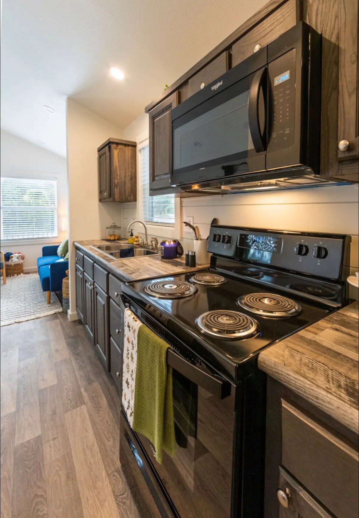 Welcome to Bluebonnet Trail! Come rest quietly in nature and enjoy all the amenities of an upscale hotel room and our unique design. Black Oak hosts a cozy queen size bed, a convenient kitchenette, and an elegant full bathroom with a soothing walk-in shower. Head upstairs to the rooftop deck to relax while stargazing or savoring your morning coffee, before heading out to play yard games and explore our walking trail. 12 minutes or less to Baylor, Magnolia Silos, Cameron Park and downtown Waco