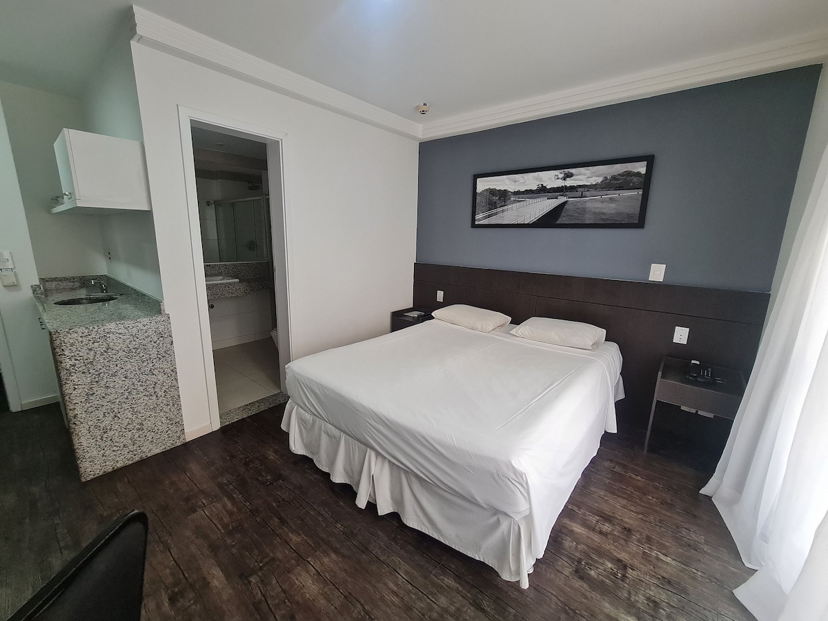 Aquí, todo es fácil y práctico, ¡desde el principio hasta el final de tu estancia! La propiedad estaba muy bien preparada y diseñada para proporcionar la mejor experiencia posible. Tiene una cama doble, lo que proporciona una sensación de amplitud. Es un buen lugar para renovar la energía. Es una habitación grande, incluso sin balcón. La ropa de cama, 2 almohadas y una manta doble están incluidas en la reservación. Todo lo que necesitas para una buena estadía