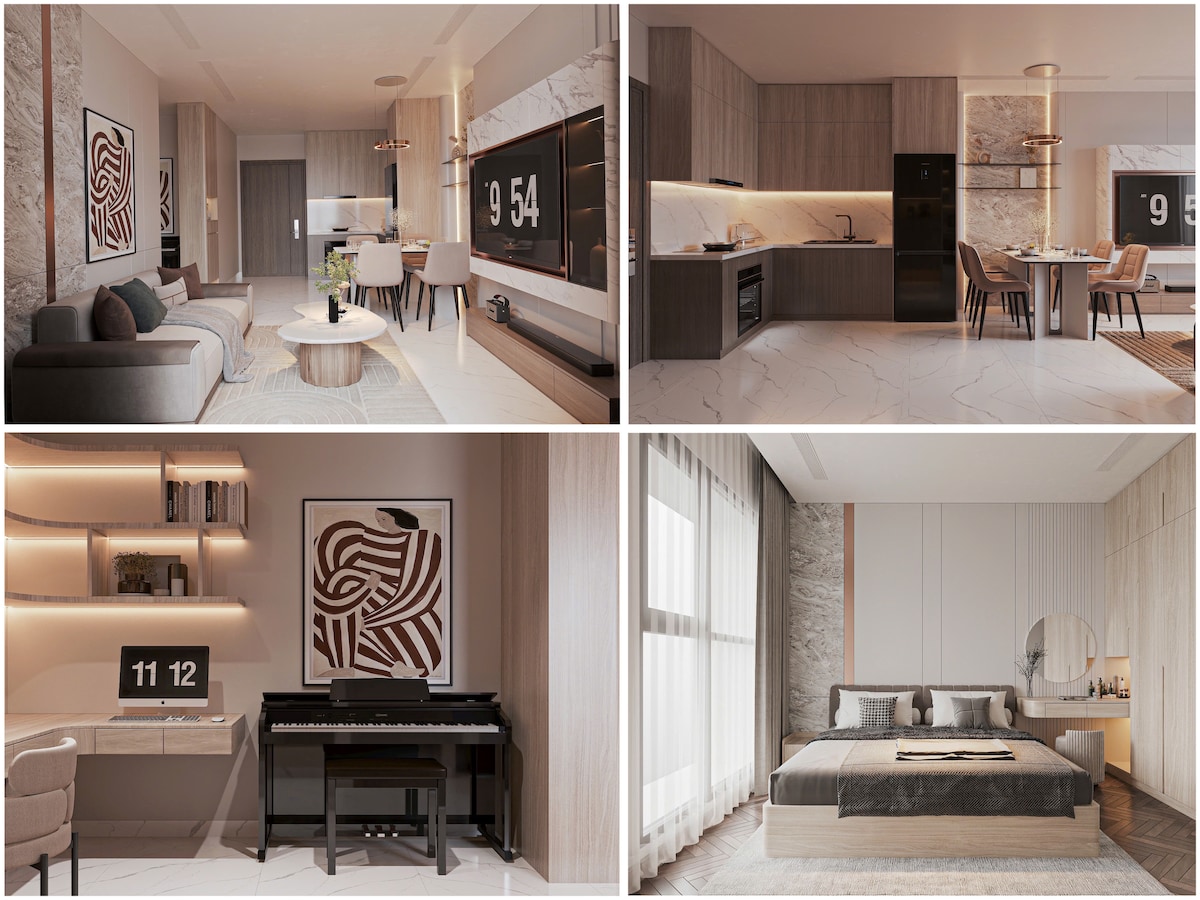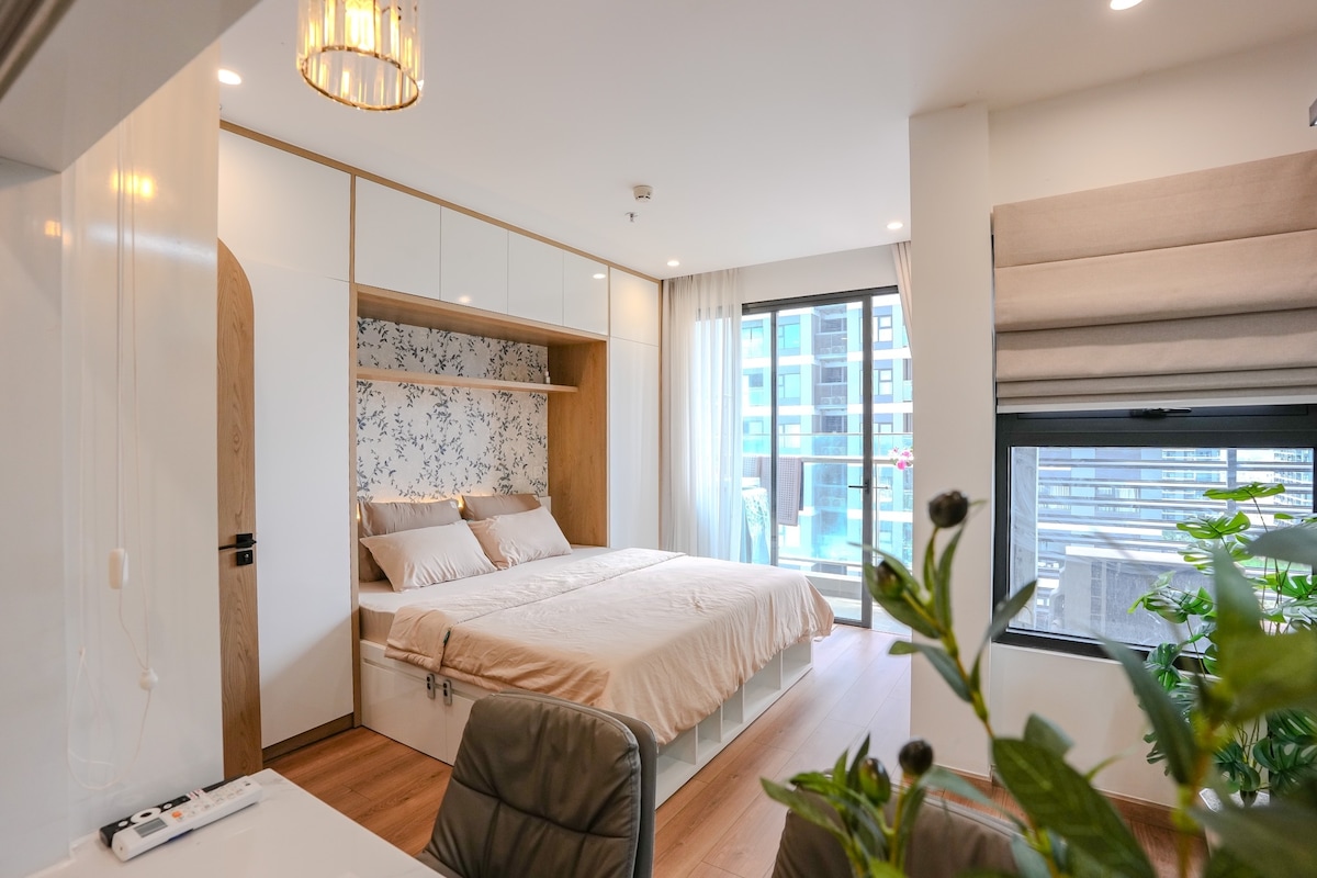 Este es un estudio moderno en mi apartamento con servicios. Es cómodo alojarse a corto y largo plazo. - Balcón y mucha luz natural y mucha luz natural. - 1m8 cama suave para dormir bien. - La cocina está totalmente equipada para cocinar. - Baño privado: lleno de elementos esenciales - Ascensor, aire acondicionado, wifi rápido, televisor inteligente, armario, escritorio, silla, sofá - Limpieza y lavandería: estacionamiento GRATUITO. Disfrutarás de una experiencia elegante en el centro de la ciudad. A solo 5 minutos del mercado nocturno y de la calle Bach Dang. #Dirección: calle D4, Thu Dau Mot City