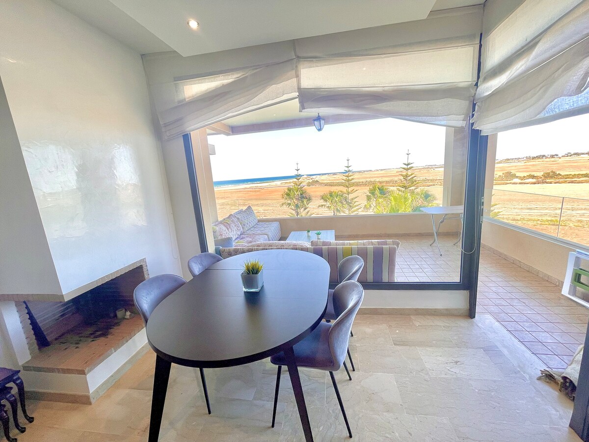 Beau Rez de jardin,,au sein du complexe balnéaire Bahia Golfe Beach ,comprenant 3 chambres,salon spacieux climatisé,2sdb,cuisine bien équipée,toute les pièces donnent sur jardin et terrasse offrant fraîcheur et ambiance chaleureuse au logement . Fibre optique.2 bicyclettes à votre disposition.parking . Une piscine disponible toute l année . Accès direct à la mer, une corniche aménagée de 3km , plage privée,hôtel Vichy,Golf club House MARJANE à proximité même des livreurs Glovo Mc Do sont dispo