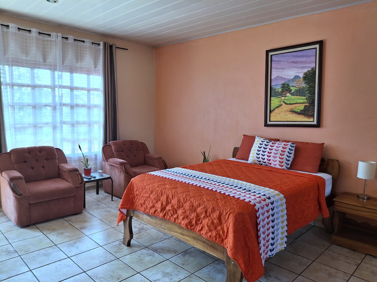 Piso recien renovado y amplio (700 sf ca): área de dormir/baño + cocina/comedor/sala de estar separadas por dos paredes arqueadas, amplia terraza con vista a árboles/playa. Cama king-size nueva, muebles y electrodomésticos y ducha caliente. Este espacio también cuenta con aire acondicionado, televisión, WiFi y estacionamiento cerrado. Ubicación ideal justo fuera del Parque Nacional Manuel Antonio y a solo 100 metros de la playa y tiendas locales, restaurantes y mercados.