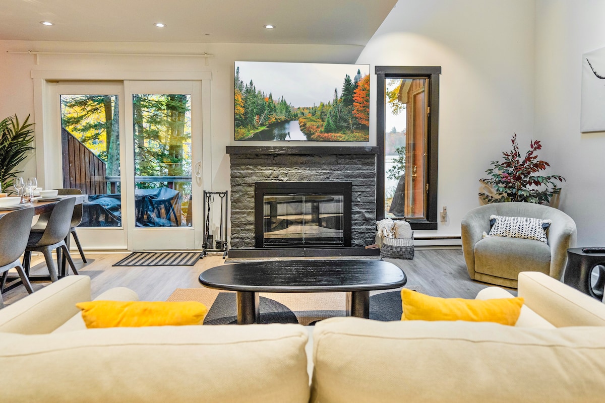 Un acogedor chalet de montaña que ofrece placeres de calidad tanto dentro como fuera. Incluye acceso gratuito al lago y a la playa en verano, ¡y también está cerca de las pistas de esquí y de golf! • En el interior encontrarás un diseño abierto que fluye a la perfección de una habitación a otra con chimenea de piedra de propano y cocina gourmet. • 2 dormitorios con camas nido y televisores inteligentes. • Bañera de hidromasaje al aire libre para 6 personas, propano en la cubierta y chimenea. La elegancia moderna y los servicios se fusionan con el encanto rústico, la tranquilidad y la naturaleza, donde crearás recuerdos armoniosos de la montaña.