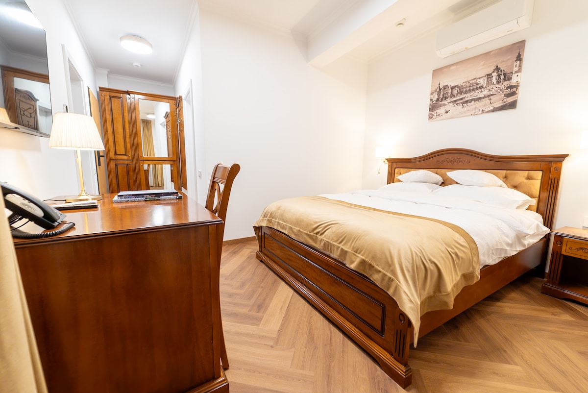 Apart-hotel elegant, situat ultracentral în Oradea, pe strada Aurel Lazăr nr. 9, ideal pentru turiști sau călătorii de afaceri. Camera dublă dispune de hol de acces, dormitor luminos cu pat matrimonial confortabil și baie privată modernă cu duș walk-in. Dotări: Wi-Fi gratuit, TV, birou, aer condiționat, încălzire și lenjerie de calitate. Locație excelentă, la câțiva pași de principalele atracții ale orașului.