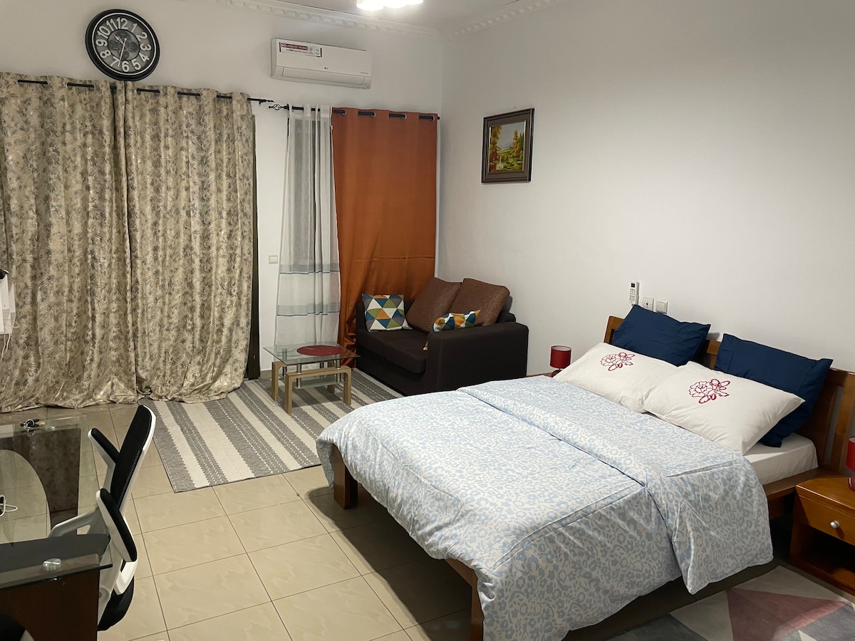Hermoso estudio con cocina equipada, baño, oficina, wifi, aire acondicionado, TV, en una propiedad verde y tranquila, con piscina en Abidjan, Riviera 3. La reserva incluye limpieza semanal gratuita, sábanas, toallas, jabón y lavandería y planchado gratuitos de la ropa de los huéspedes. Es posible que compartas la piscina y el jardín con otros huéspedes. Se puede añadir una cama supletoria para un tercer huésped. La propiedad es tranquila y tiene muchos árboles. Se encuentra a 10 minutos a pie de tiendas y restaurantes.
