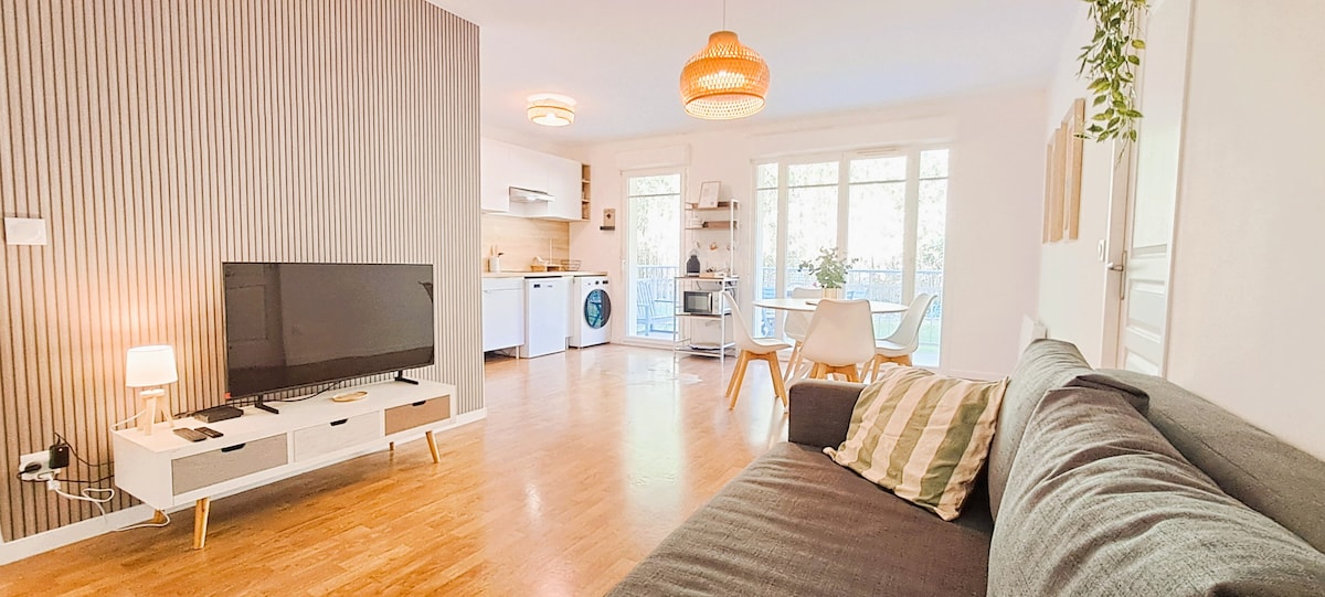 En el borde del bosque, cerca del carril bici que conduce al lago y al mar. Cerca de supermercado, panadería...500 m Encantador alojamiento con un dormitorio (una cama para 2 personas), un baño contiguo, una zona de comedor con cocina americana ( nevera, fogones y microondas), una zona de estar con TV y acceso wifi. Terraza con muebles de jardín y zona de comedor con plancha, vistas al bosque. Posibilidad de préstamo gratuito de 2 bicicletas para disfrutar de los carriles bici de los alrededores. Bolera cercana.