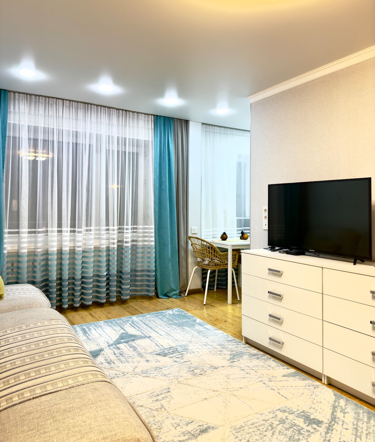 Bright and cozy modern apartment in the center of Bishkek, located in a quiet green courtyard. Fresh renovation, natural wooden floors, new furniture, and modern appliances create a warm home like atmosphere. One bedroom with a walk in wardrobe, living area, and fully equipped kitchen. Orthopedic mattress, fast Wi Fi, cable TV, air conditioning, and a comfortable workspace. Open balcony facing a green yard and a loggia on the opposite side. Self check in via secure lockbox. Ideal for your stay.