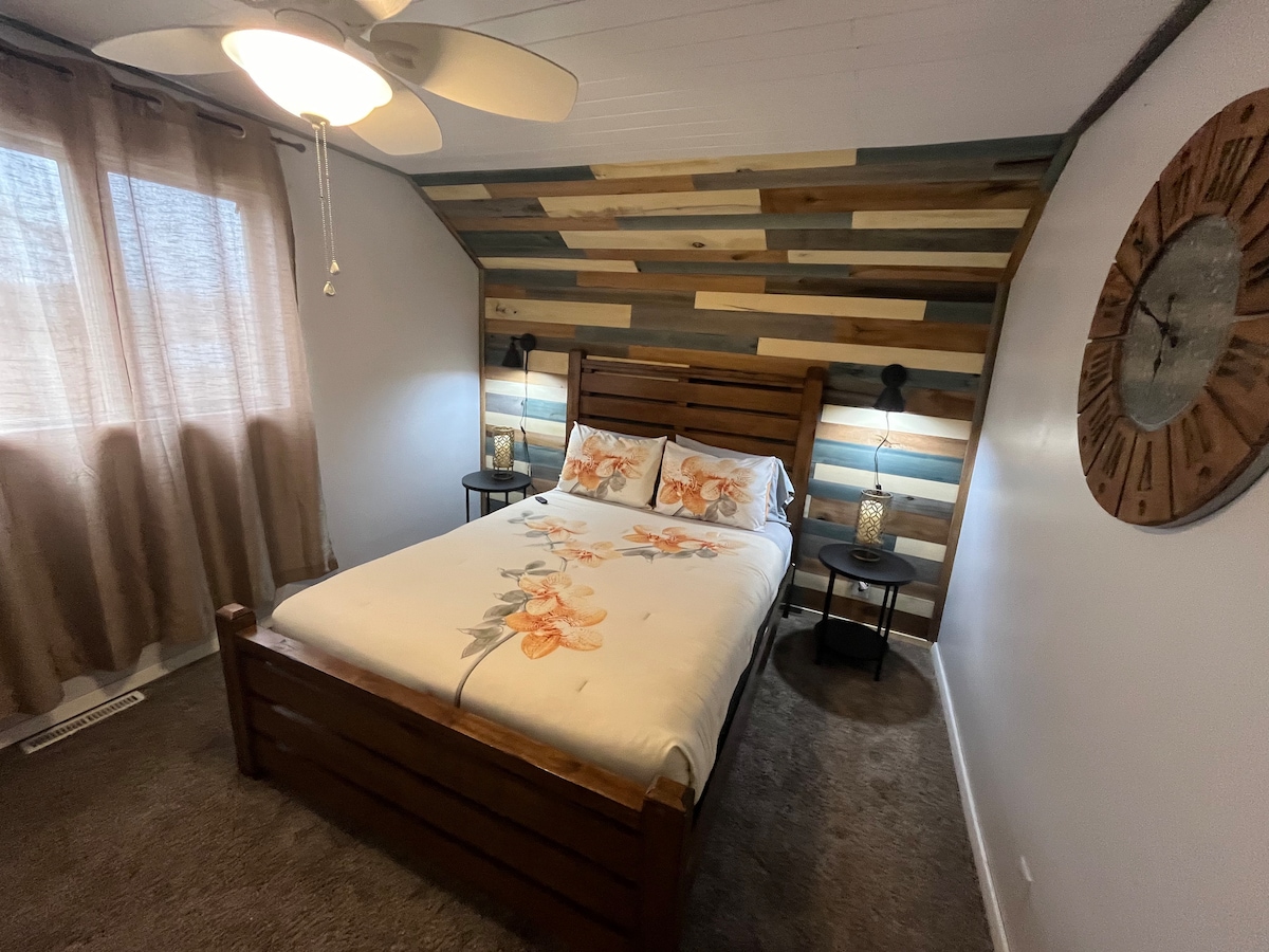 Relájate en este alojamiento único y tranquilo. Esta casa de 3 pisos, 3 dormitorios y 2 baños acaba de ser renovada y se encuentra a poca distancia a pie de los servicios de la ciudad, lagos cercanos y atracciones locales. El piso principal tiene suelos de madera, cocina completa, comedor, rincón para desayunos o espacio de trabajo, 2 dormitorios con camas queen y televisores, y 1 baño. El nivel superior tiene 1 dormitorio con 1 baño, lavadora y secadora en el nivel inferior, con área abierta para almacenamiento, etc. Patio trasero grande y tranquilo con chimenea. Puede acomodar a una familia grande o a un grupo pequeño, hay colchones inflables disponibles si es necesario. Ideal para estancias cortas o largas.