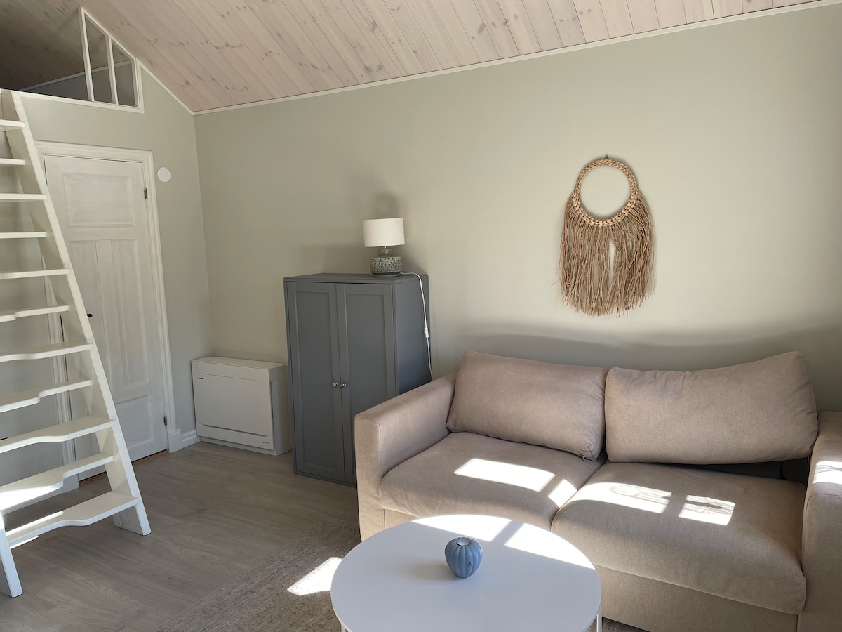 Casa de huéspedes recientemente renovada en la granja. Te damos la bienvenida en el campo. Bonita casa en dos pisos con baño y cocina nuevos. Luminosa y espaciosa. La casa se encuentra en nuestra pequeña granja donde hay perros, gatos, pollos y caballos. Un idilio rural y al mismo tiempo cerca de todo. El mar a 12 minutos en coche, un sinfín de oportunidades de senderismo, un lago para nadar cerca.