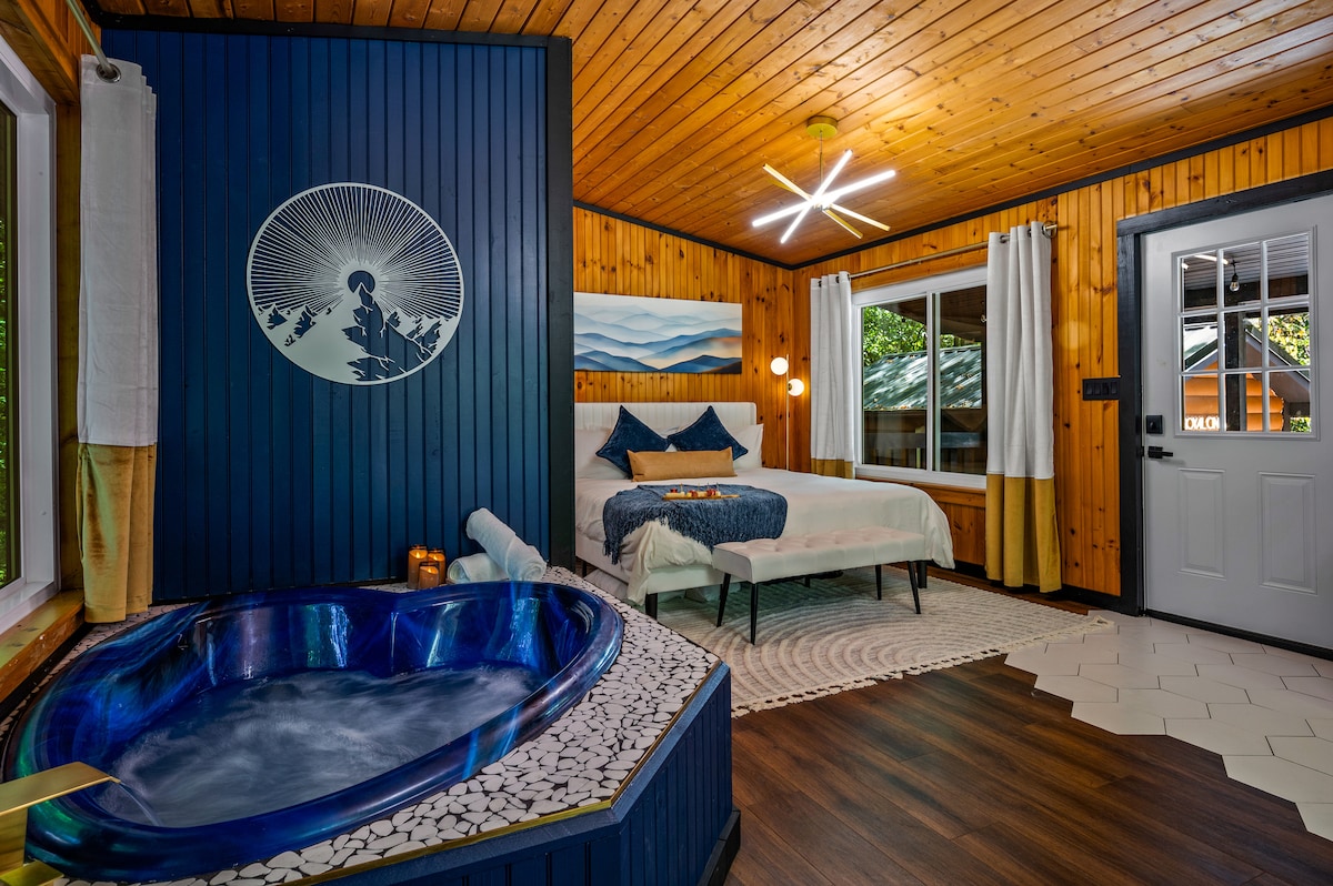 Cabaña para parejas con bañera de hidromasaje, chimenea al aire libre y duchas