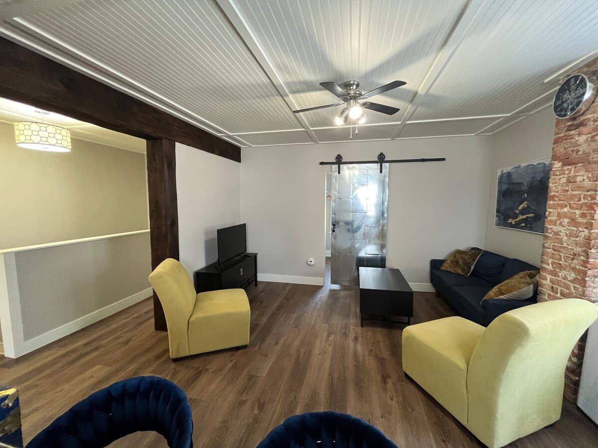 Our Guest House (690 sq. ft.) with 12 foot ceilings is filled with all the conveniences. Imagine being able to walk to the historic downtown shopping square, restaurants, Lake Huron, concert venues, ... Your retreat has WiFi, TV, kitchen (Air Fryer, Toaster Oven), French Press for coffee. RADIANT HEATING ON FLOOR, air conditioning, ceiling fan, comfortable workspace (round table) and free parking. You have your own outside patio, and Private Keypad entrance.