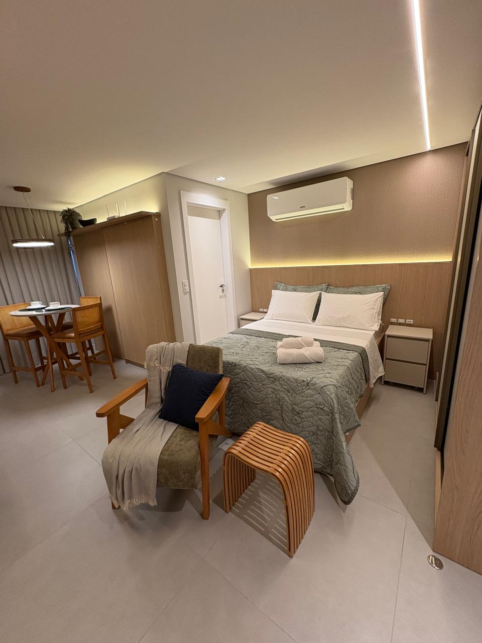 Sofisticado apartamento tipo estudio ubicado a 800 metros del parque Vila Germânica, lugar de eventos como el Oktoberfest. Rodeado de restaurantes, bares y supermercados. Todo para su comodidad: Smart TV 50" Samsung, aire acondicionado split, ducha de gas, wifi fibra 240mb, cocina completa con heladera Brastemp, microondas, horno, estufa, campana extractora, cafetera, purificador de agua, lava y seca, armarios, y por supuesto ¡una cama queen con el mejor colchón!