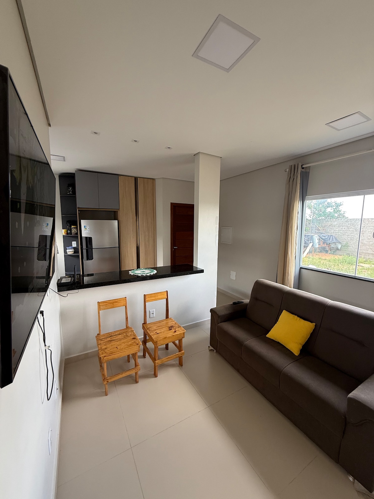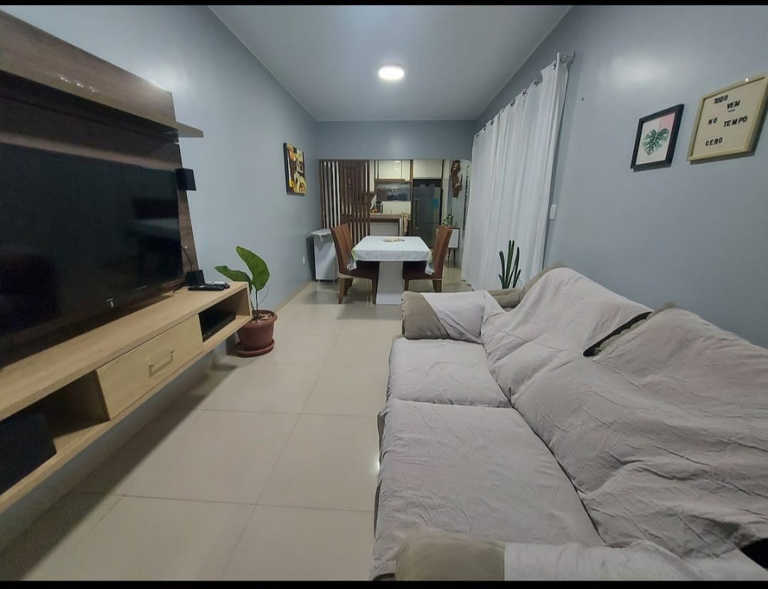 Relaxe com toda a família nesta casa térrea com ar condicionado nos três quartos e ar condicionado na sala. Dois banheiros com chuveiro elétrico. Cozinha com fogão, microondas, geladeira e outros utensílios. Área externa com churrasqueira com mesas e cadeiras, grama sintética e lavanderia O condomínio possui DUAS vaga de garagem.