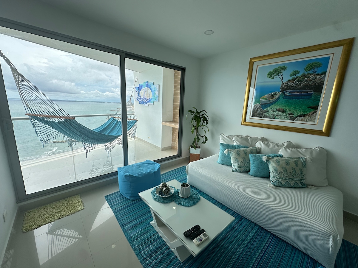 Disfruta un elegante apartamento frente al mar en Bocagrande, con vista directa al Caribe. Cuenta con 2 habitaciones, 2 baños, sala amplia con sofá cama, cocina totalmente equipada, WiFi de alta velocidad y balcón privado con sillón colgante. Aire acondicionado en todas las áreas. Perfecto para familias y grupos que buscan comodidad, ubicación privilegiada y acceso inmediato a la playa. Todo está pensado para una estancia moderna, práctica y relajante.