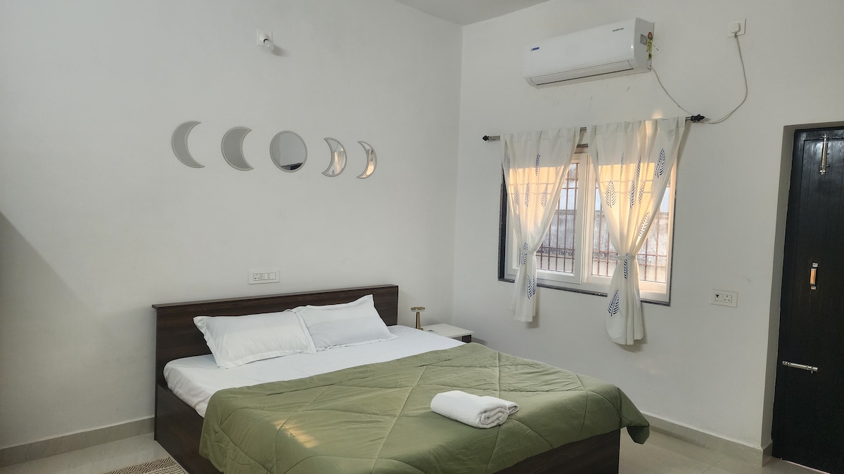 ¡Bienvenido a Nirvaana Homestay! A solo 1,5 km del templo del árbol Bodhi, nuestra casa de 3 dormitorios ofrece vistas al templo desde los balcones adyacentes. Disfruta de comodidades modernas como wifi, aire acondicionado, televisores en cada habitación, baños privados, una amplia sala de estar, cocina y aparcamiento. La propiedad es espaciosa, está bien iluminada y cuenta con iluminación ambiental. Estamos aquí para que tu estancia sea cómoda y tranquila mientras exploras el encanto espiritual de Bodhgaya.