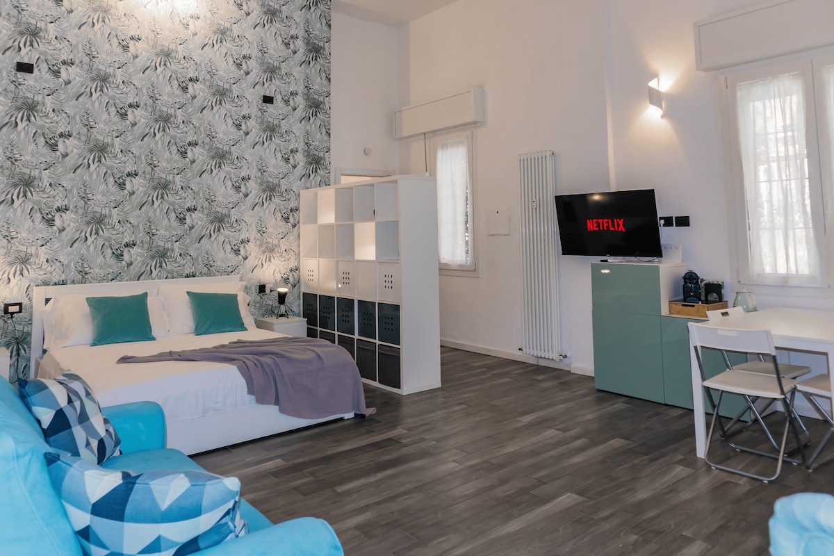 Alegre apartamento de dos habitaciones en un edificio luminoso y tranquilo con ascensor en la cuarta planta. Un azul fresco y confortable te dará la bienvenida. En un edificio antiguo y prestigioso de principios del siglo XX sin barreras arquitectónicas para sillas de ruedas. Totalmente equipado con cualquier tipo de comodidad para ti y tus bebés. Restaurante, supermercado y todo lo que necesitas están a poca distancia a pie del apartamento. A poca distancia a pie del corazón de Bolonia, Feria, estación de tren, hospital S. Orsola y también del Teatro Comunale. Una plaza de aparcamiento gratuita en el patio.