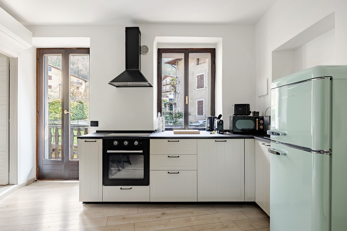 NEW COLORS AND KITCHEN Alps and Garda lake experience in one. Single 1860 house in a small village lost in the mountain,rebuilt and refurbished as a 90 sq. meter minimal apartment on two floors. Private entrance,spacious living room ,55 inch tv, separated kitchen, bedroom and bathroom on the top floor. Youtube premium Available indoor bike storage free parking You can easily reach Garda lake and the surrounding mountains. Extra free beer tasting experience by BirrificioRethia