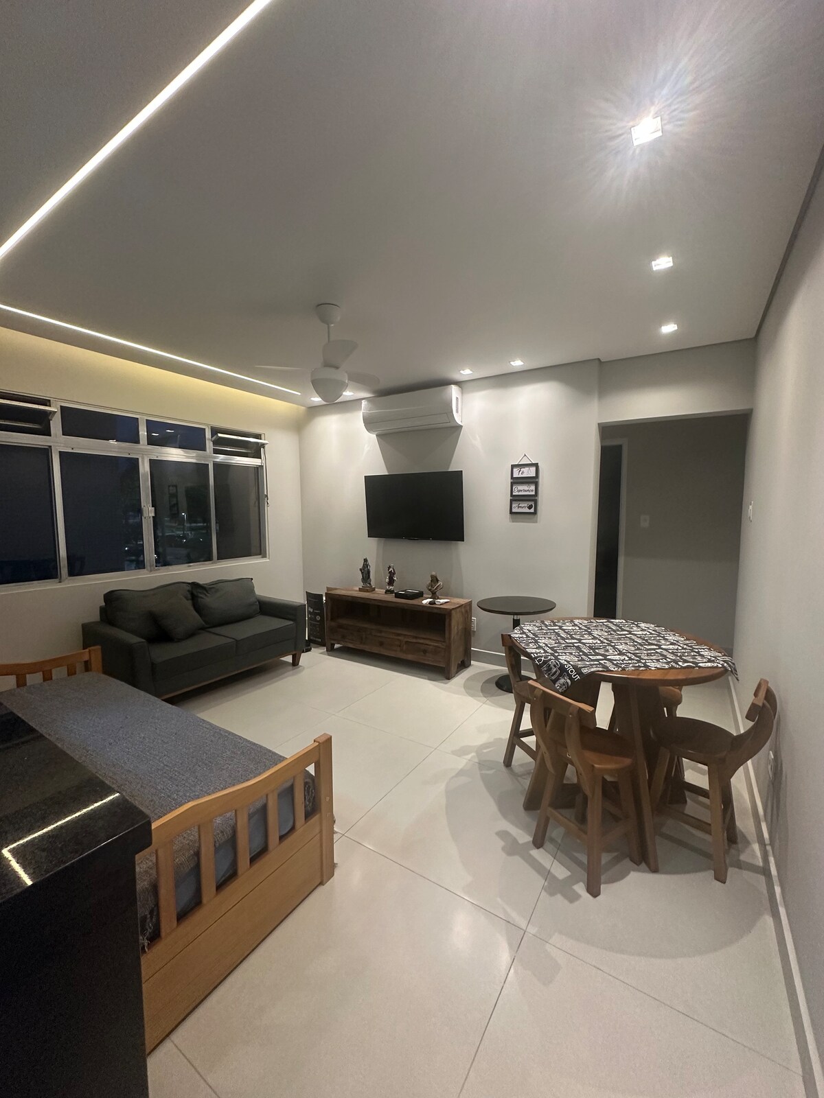 Modern apartment on Aparecida beach. Excellent location, building in front of the beach, close to the bars of channel 5 and the Praiamar shopping mall. On a high floor, with partial sea view, on 3 balconies. Well equipped kitchen (gas grill, microwave, electric oven, cooktop, brewery, wine cellar, coffee makers and dishwasher). Social bathroom. Suite with queen bed, whirlpool and bathroom. Bedroom with 2 king single beds. Mattress/sofa available. Laundry with machine. Air-conditioned.