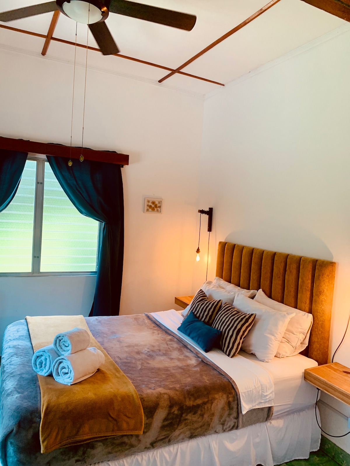 Hermosa habitación privada con balcón privado con vistas, en una propiedad tranquila y verde con un arroyo que fluye justo en el centro de Boquete. Transporte público, tiendas, restaurantes, bicicletas, farmacias, banco y supermercado, todo a poca distancia a pie. Boquete tiene una temperatura promedio de 77 grados durante el día y 66 grados fahrenheit durante la noche, por lo que no se necesita aire acondicionado.