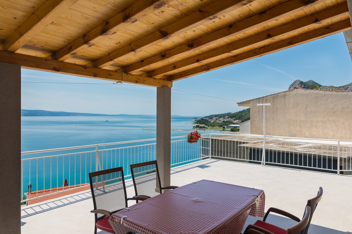 Este apartamento bellamente decorado está situado en el ático de una casa familiar. Tiene 1 dormitorio, sala de estar con cocina y baño. En la parte delantera hay una gran terraza con muebles de jardín. Parte de la terraza está cubierta, por lo que los huéspedes pueden disfrutar de la sombra incluso cuando el sol brilla con más fuerza. El descanso en la terraza se verá embellecido por la vista del mar, la ciudad histórica de Omiš y los acantilados por encima de ella. El mar está a unos 300 m y se puede llegar a él por escaleras o por una carretera local sinuosa.