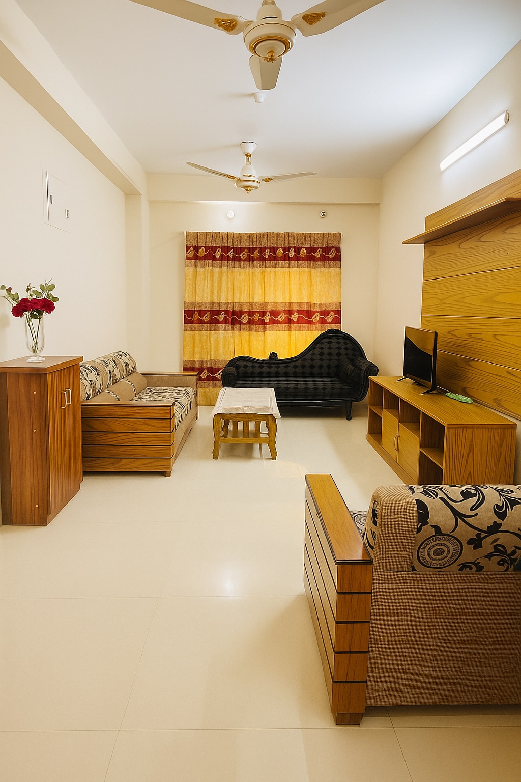 Este es un apartamento bien iluminado y recién amueblado. Cuenta con 2 dormitorios (1 aire acondicionado) y el dormitorio principal tiene gizer, armario, gran TV inteligente wifi con conectividad Full HD DTH 24/7 que incluye canales locales e internacionales, nevera grande, horno microondas, purificador de agua, wifi de alta velocidad 24/7, botiquín de primeros auxilios, zapatero, sofás, mesa de lectura/portátil, chimenea de gas, utensilios de cocina, mesa de comedor con los elementos necesarios, sábanas limpias, toallas, mantas, etc.