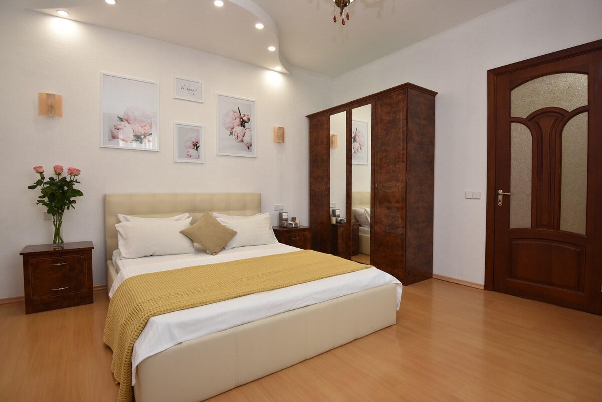 Apartamento en un edificio de clase ejecutiva. Renovación elegante en colores claros. Equipado con todos los electrodomésticos necesarios para una cómoda Ideal tanto para viajes de placer como de negocios. La casa cuenta con tres restaurantes (cocina europea, italiana y mediterránea); un gimnasio; aparcamiento seguro. Un gran supermercado Novus está a 2 minutos caminando de la casa. El centro comercial Komod se encuentra a 5 minutos a pie, que cuenta con un moderno cine Multiplex. El Centro Internacional de Exposiciones está a doscientos metros.