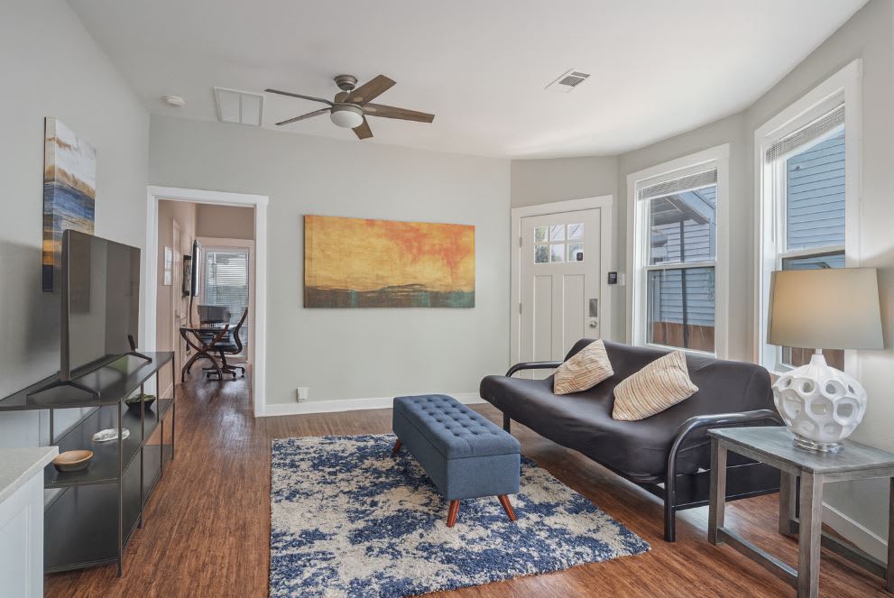 2 dormitorios, 2 baños - 845 pies cuadrados. ¡Recién reformado! Apartamento moderno, a 1,5 millas del centro de la ciudad y del paseo fluvial. ¡Ropa de cama de calidad hotelera! Totalmente equipado (todo lo básico y más), lavadora/secadora completa, cocina y patio privado solo para huéspedes con parrilla de gas y salón privado al aire libre y jacuzzi de 5 plazas. Registro autónomo, entrada sin llave, wifi, televisores inteligentes con Roku y plan sin anuncios de Hulu Live. Habilitado para tu Netflix, HBO Max, Paramount+, Disney+, etc. Airplay. Wifi de alta velocidad incluido.