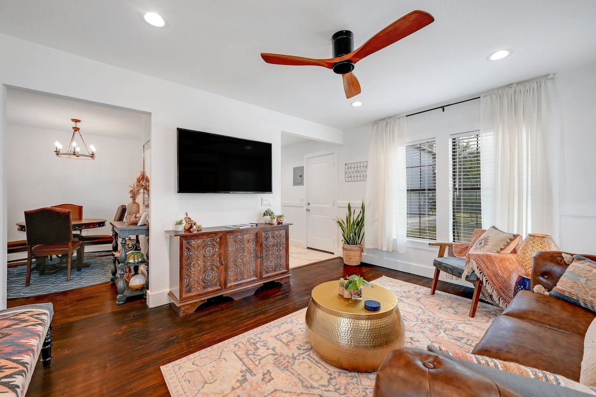 ¡Hermoso hogar construido en 2021! Amueblado con el estilo que llamamos "fiesta de mediados de siglo" por un diseñador de interiores local. Esta casa ofrece 3 dormitorios, 2,5 baños, 2 salas de estar y un hermoso patio del tercer piso. Mahncke Park se encuentra junto a Alamo Heights, justo al final del camino de DT y de muchas atracciones que te esperan. Tienes The Pearl District, The Alamo, el famoso Riverwalk, el Jardín Botánico y muchos museos. Cocina totalmente equipada, dos televisores inteligentes, wifi, entrada sin llave y estacionamiento.