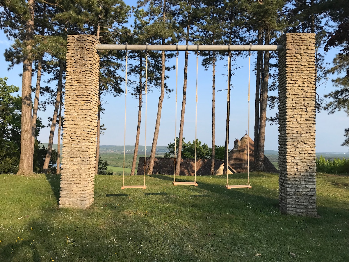 @CasaMágicaDiteGiverny Venga a disfrutar del esplendor de la naturaleza en nuestro verdadero remanso de paz sin vecinos. Esta casa atípica le ofrece unas vistas impresionantes y despejadas de los campos y las colinas. El balcón orientado al sur le trae el buen aire del campo acompañado del canto de los pájaros y la dulzura del sol. La gran sala de estar le da la bienvenida en su ambiente relajado rodeado de ventanales. El dormitorio grande le ofrece una cama king-size con todas las comodidades con vistas a las estrellas.