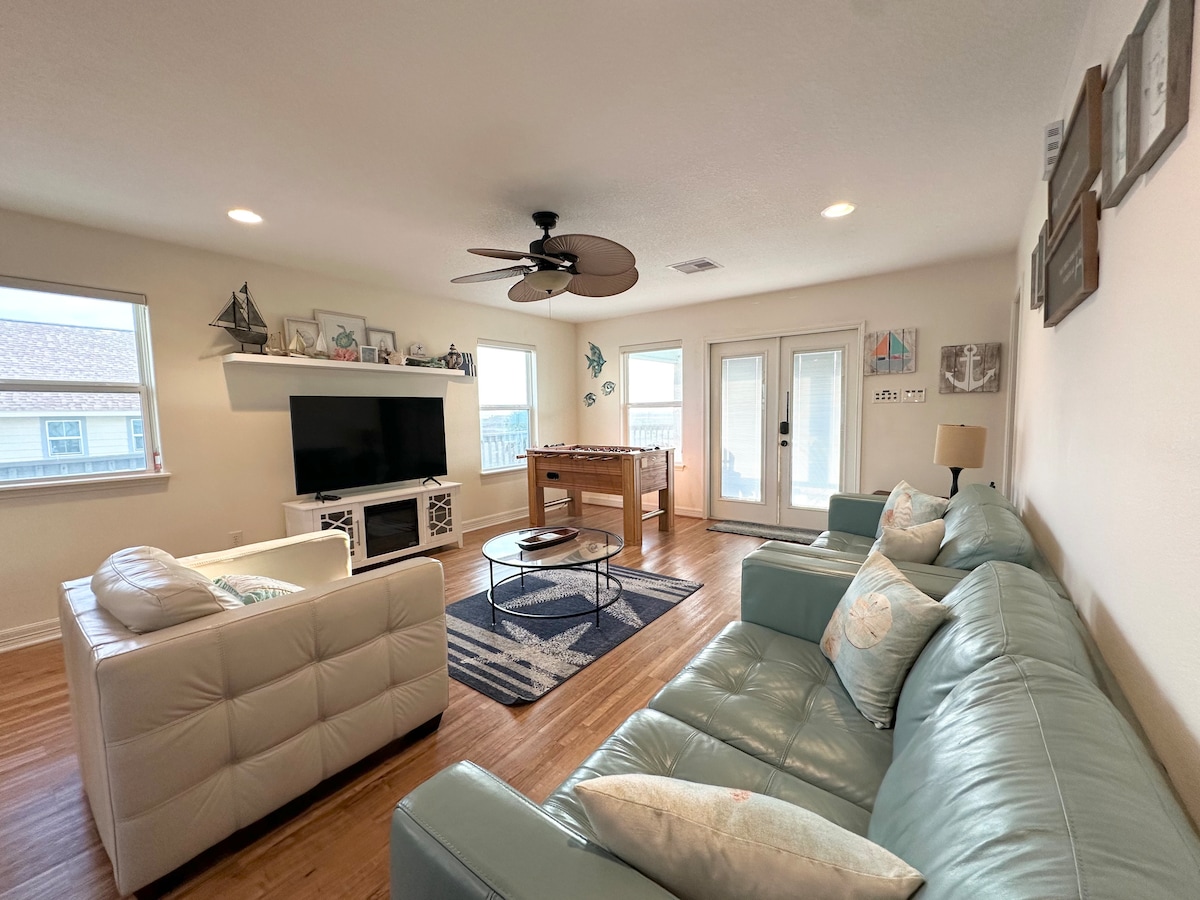 Relájate con toda la familia en nuestra robusta casa de playa recién reformada, ubicada a pocos pasos de la playa. Nuestra gran casa está situada en un amplio terreno esquinero y cuenta con vistas a la playa y a la bahía. Disfruta escuchando las olas del mar y las impresionantes puestas de sol mientras bebes café o vino en nuestra terraza extragrande. Disfruta de s'mores en nuestro fogón al aire libre. Nuestra casa no es un típico AirBNB de Galveston, ya que es la casa de vacaciones de nuestra familia y está muy bien mantenida.