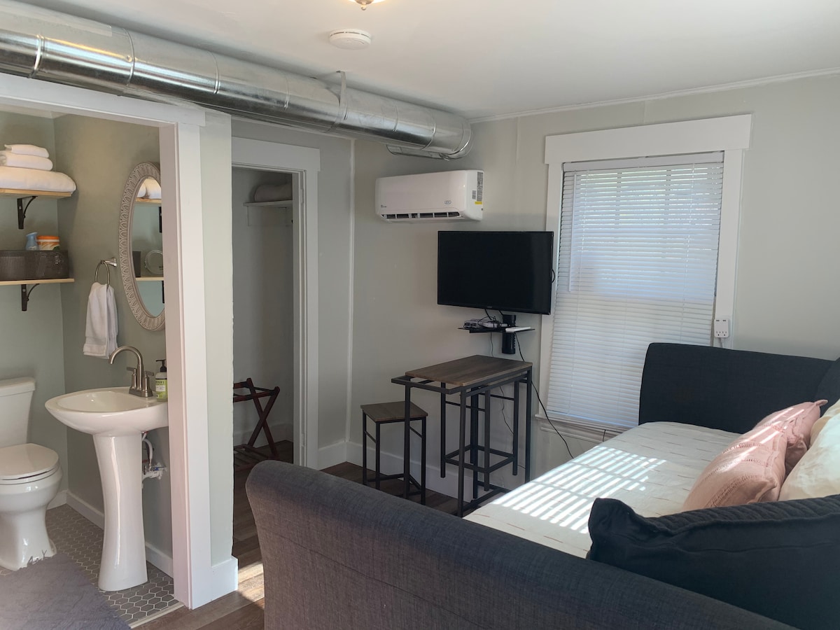 This 1921 bungalow is 15 minutes from downtown Chattanooga, Rock City, and Ruby Falls yet with a rural wooded feel. Redesigned and renovated with new furnishings and appliances make your stay comfortable and worry-free. One queen bedroom with a large window overlooking the back deck; a living room with a seasonal wood-burning fireplace, queen sofa bed, and vaulted ceiling make this tiny bungalow feel spacious, airy, and light-filled. Kitchen and dining area are fully equipped for longer stays.