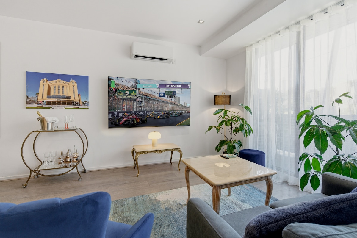 Este apartamento de dos dormitorios tiene unas vistas impresionantes de Port Phillip Bay y Melbourne CBD. Está a 80 metros del tranvía de la ciudad y a 10 minutos en tranvía de MSAC. La plataforma de observación de pingüinos y el circuito australiano de Fórmula 1 están a 10 minutos a pie. Hay numerosos restaurantes, muchos a poca distancia. Un punto destacado son las bebidas en el balcón mientras el sol se pone sobre la bahía. Y los madrugadores pueden ver los globos aerostáticos mientras se desplazan por la ciudad.