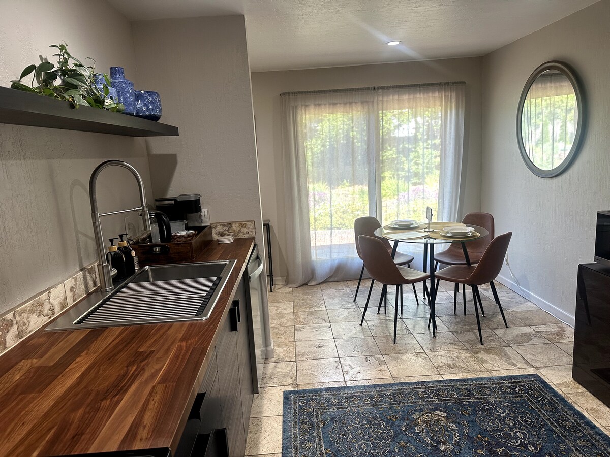 ¡Esta suite privada es un trocito de paraíso en un entorno boscoso! Se accede a través de un tramo de escaleras de jardín, tiene una entrada privada, estacionamiento dedicado en la calle, un patio privado, un lujoso baño grande con ducha a ras de suelo para 2 personas, una gran bañera de hidromasaje para 2 personas, suelos radiantes, aire acondicionado, mininevera, horno tostador y microondas. El dormitorio cuenta con una cama tamaño queen, mesa para dos, TV inteligente de pantalla grande y señal wifi de fibra óptica potente. Ubicada en un hermoso barrio con maravillosas caminatas justo en la puerta.