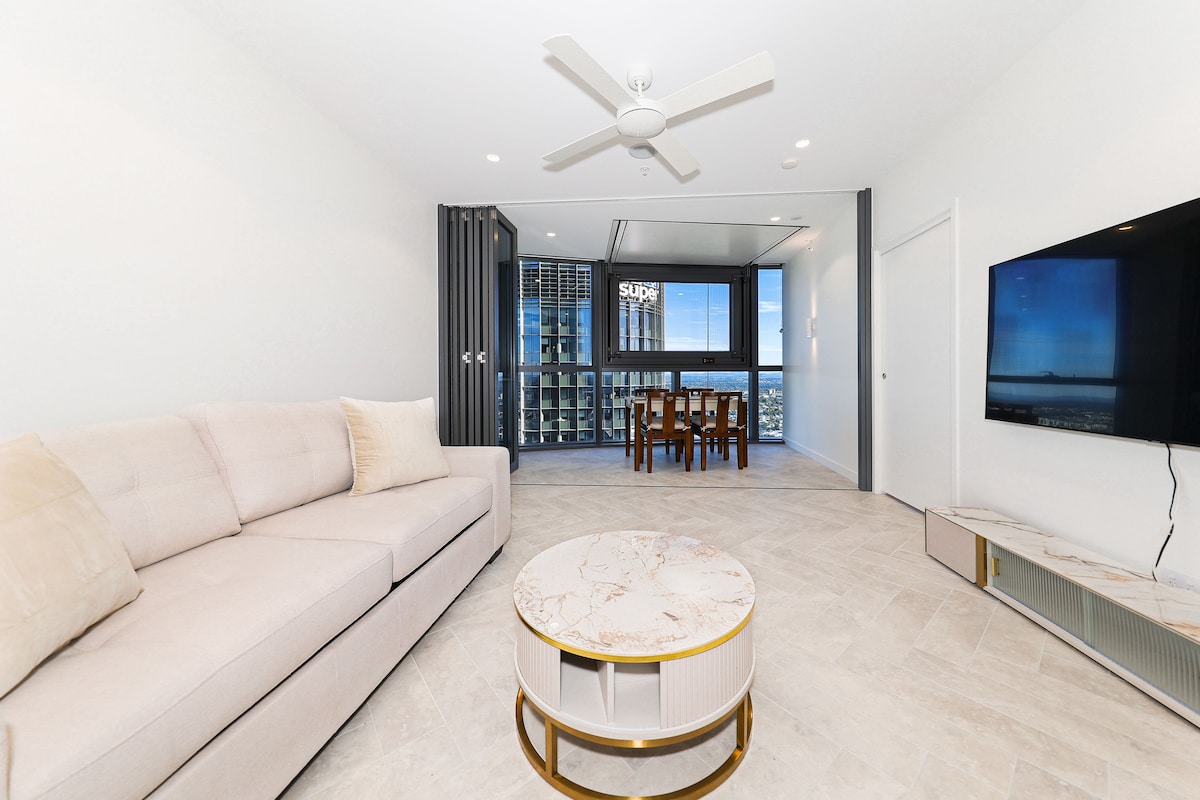 Find your calm in this Diamond-Class 1BR retreat on Level 59 of Queen’s Wharf. Enjoy sweeping river & city views, a breezy electric window, modern interiors and high-speed Wi-Fi—just steps from South Bank, Botanic Gardens and Brisbane’s finest dining. Ideal for couples, corporates and weekend escapes. ✔ No Added Cleaning Fee ✔ King Bedroom & Sofa Bed (Sleeps 4) ✔ Full Kitchen & Open Living ✔ Indoor Electric Balcony Window ✔ Smart TV & Wi-Fi ✔ Pool, Gym, Sauna & Restaurants Learn more below 👇