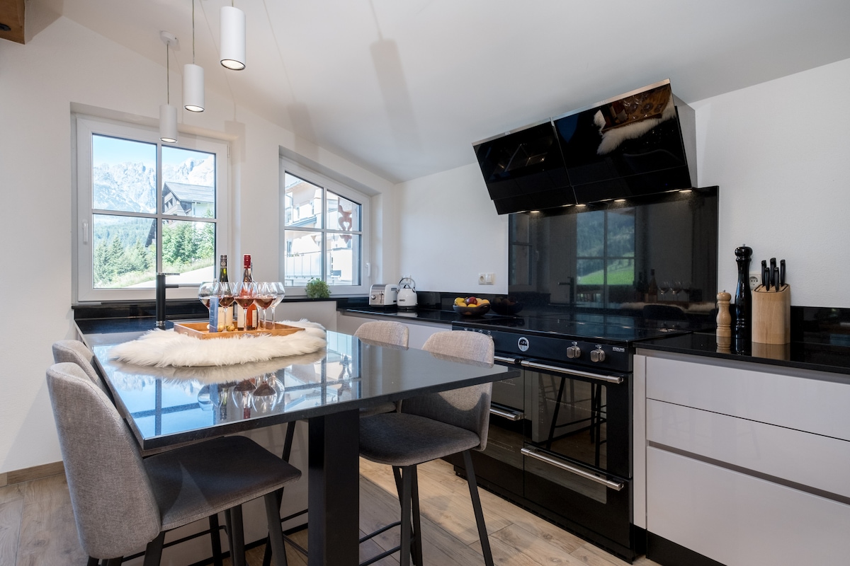 Luxe Alpine Chalet (230m2) in Mühlbach voor 10 personen met een fantastisch uitzicht! 5 luxe slaapkamers en 5 luxe badkamers, sauna, openhaard en kookeiland. MIELE apparatuur, SAECO espressomachine, QUOOKER, EV-laadstation (11kW) en veel (gratis) extra's! Gebouwd in 2022 en voorzien van alle moderne gemakken en mooie materialen. De gezellige en warme uitstraling, houten deuren met een hoogte van 220cm en subtiele accenten in het interieur, maken van dit chalet een Top-Chalet!