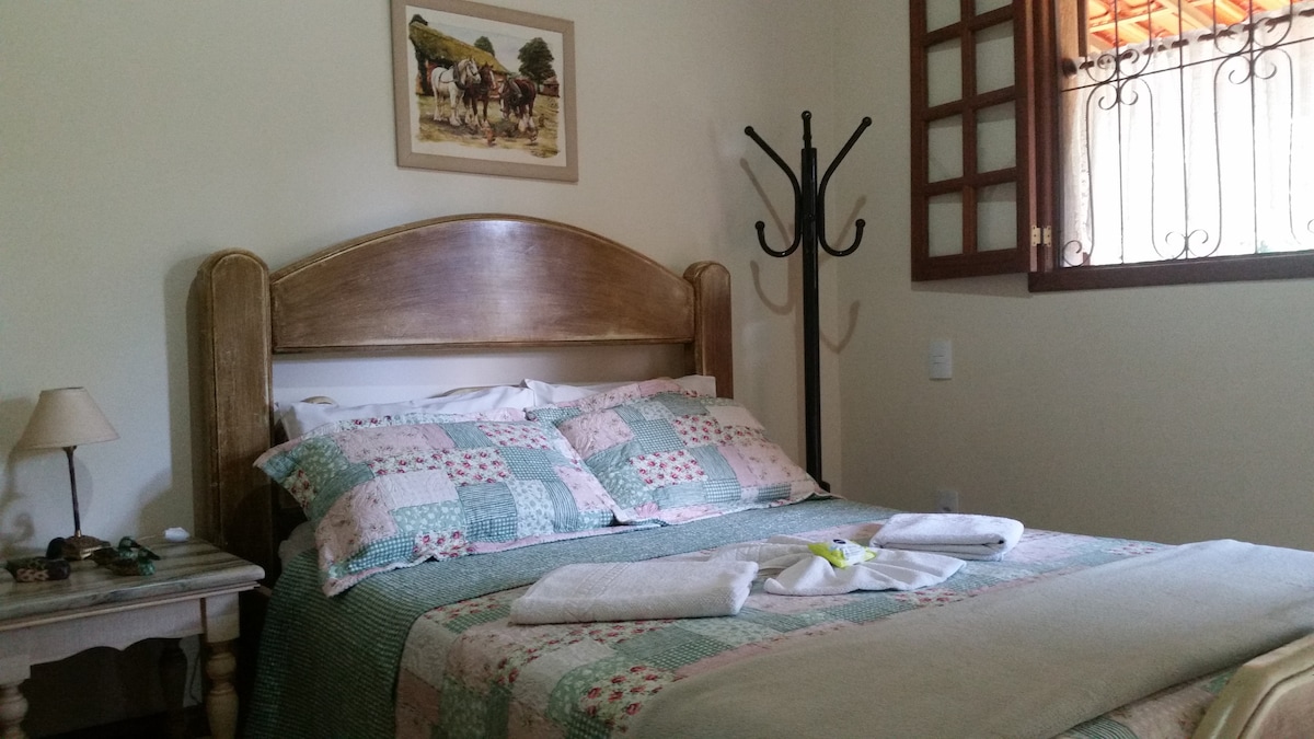La tarifa diaria de R$ 400.00 es para dos personas los fines de semana (excepto en días festivos) e incluye desayuno. Nuestros apartamentos tienen baño privado con una caja blindex, un balcón con vistas al bosque, un televisor de pantalla plana, una cama de caja, wifi, un minibar y un ventilador de techo. Además de tener una piscina, sauna, chimenea, vinos, zona de barbacoa, sala de eventos, estamos cerca de cascadas, senderos forestales y lago. Todo esto en la Royal Road a cuarenta minutos de Belo Horizonte. Hablamos inglés .