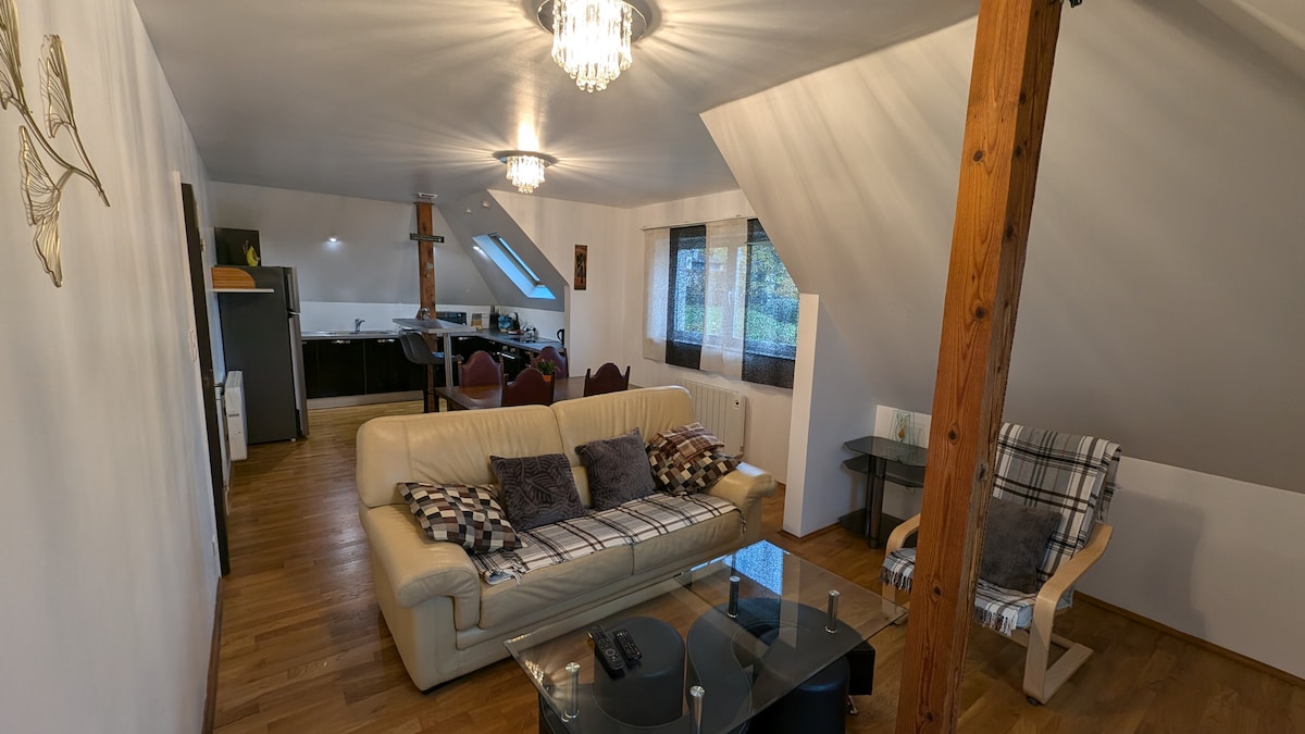 Bajo el techo, espacio amplio, luminoso, tranquilo e independiente en el segundo piso de una casa con carácter. Dos grandes ventanas de techo te ofrecen unas vistas inmejorables de los Vosgos. El alquiler incluye la habitación principal, un dormitorio contiguo con una cama doble, un baño, una pequeña cocina y un altillo con 2 colchones colocados sobre tatamis. La restauración se ha realizado con materiales ecológicos... ¡y con mucho cuidado y cariño! ¡Tiene acceso al jardín a su antojo!