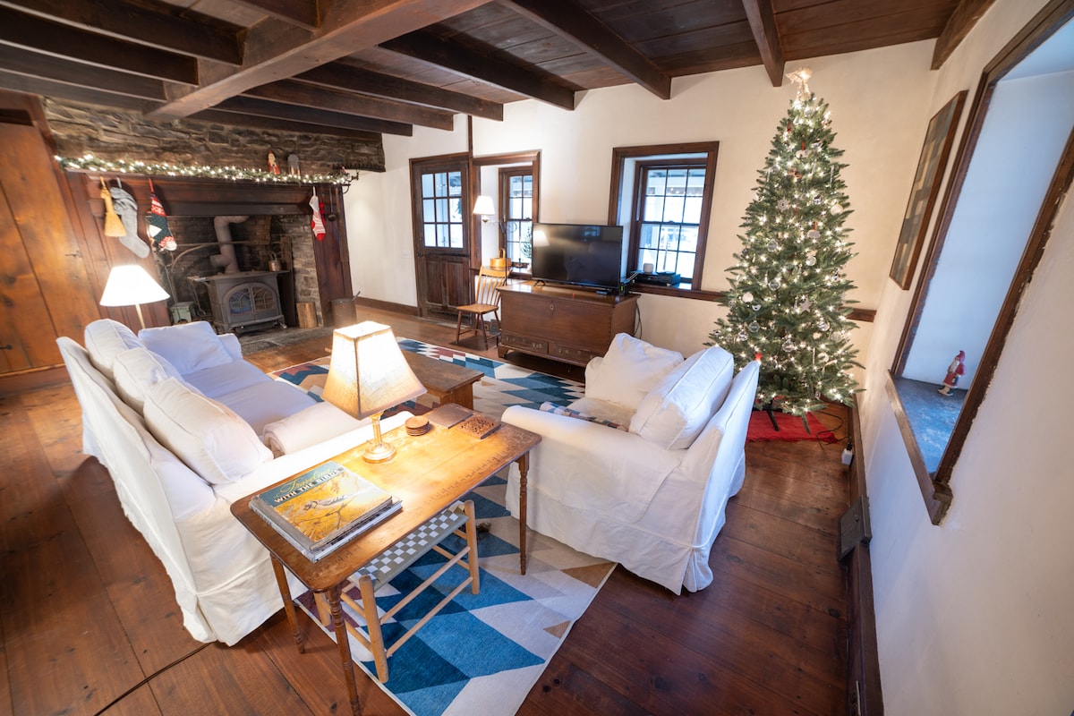 Esta auténtica granja de 1700 tiene 3 dormitorios con piscina de temporada y jacuzzi de leña en una bucólica propiedad de 13 acres. A pocos minutos del aeropuerto Van Sant, el lago Nockamixon y el canal de Delaware, esta encantadora casa rústica cuenta con comodidades modernas, aire acondicionado central, armarios de cocina con puertas de granero y una gran chimenea de piedra equipada con una estufa de leña. La propiedad es perfecta para pequeños grupos de amigos y familiares que disfrutan de la tranquila vida en el campo. La casa tiene capacidad para 5 personas y admite perros.