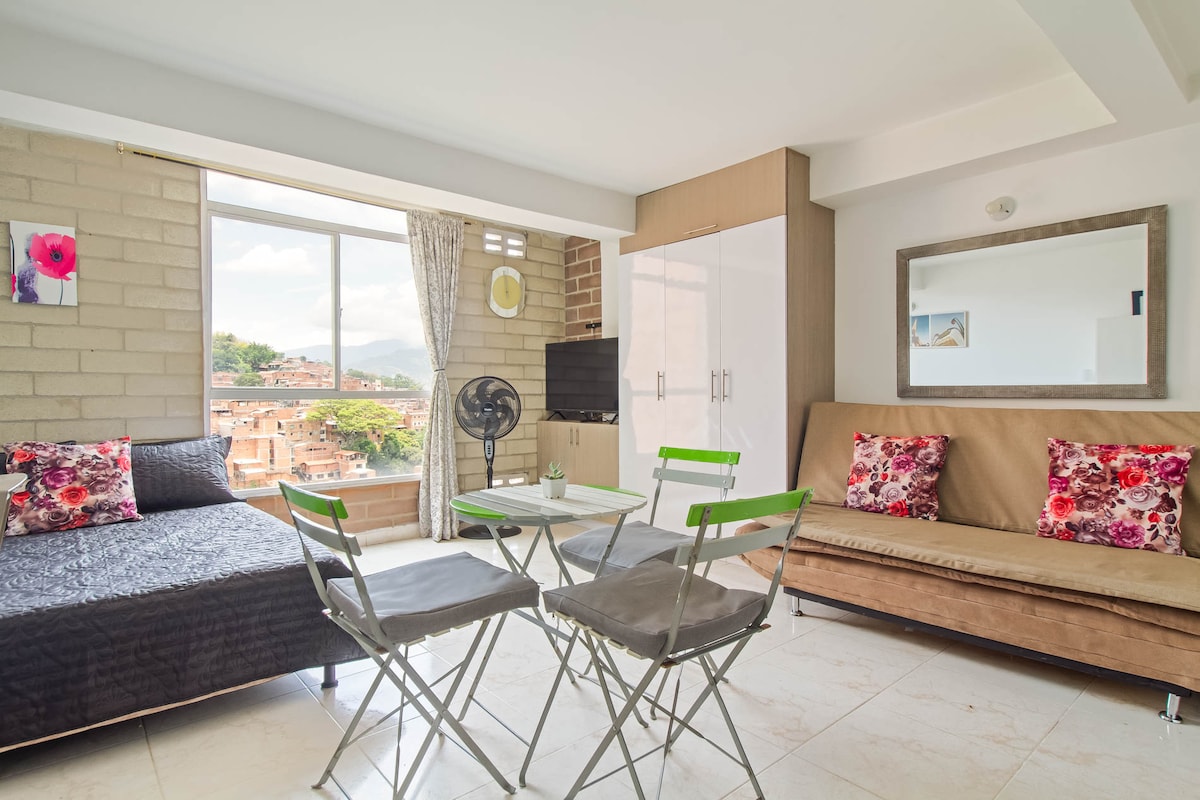 🛎️ ¡0% de tarifa de servicio en Airbnb! 🛎️ ✨ Exclusivo para quienes reserven con nosotros ✨ Hermoso apartaestudio en el piso 21 con vista panorámica de Medellín. Totalmente amoblado y equipado para estancias cortas o largas. 🌆 Zona residencial con portería 24 horas, rodeada de edificios, cerca de restaurantes, supermercados y con fácil acceso a tranvía, metro a minutos, taxis y buses a la mano, para moverte por la ciudad con total comodidad.