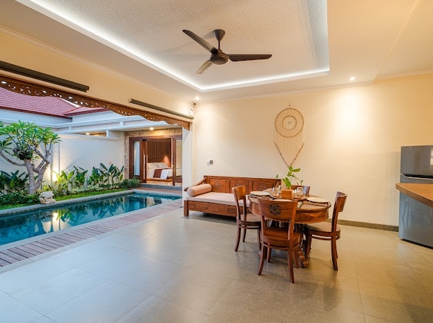 Villa moderna de 1 dormitorio con piscina privada en la mejor zona de Ungasan: • Habitación elegante con iluminación de diseño y paredes de vidrio • Baño privado con artículos de tocador de primera calidad • Piscina privada con luces brillantes y exuberante jardín tropical • Rincón del salón con lámparas colgantes tejidas • Cocina y comedor totalmente equipados. - Wifi de 300 Mbps. • Limpieza diaria con toallas y sábanas limpias incluidas • Netflix, PS5, artículos para bebés a pedido • Conserje para alquiler de scooters, tours y más • Se admiten mascotas • Depósito reembolsable de 500.000 IDR