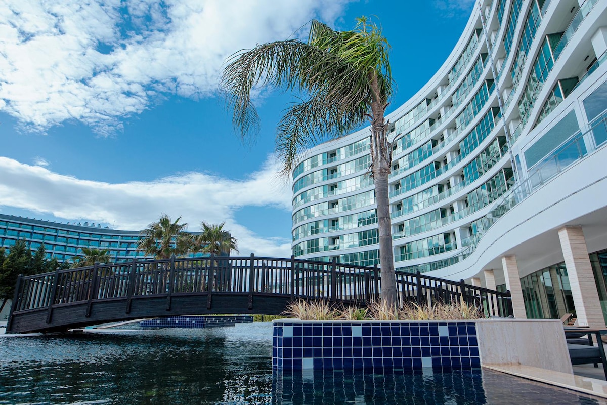 Este apartamento está bien decorado y ofrece comodidad en el hogar. Puedes recoger maravillosos recuerdos de vacaciones con tus familiares y seres queridos. Olvídate de tus preocupaciones en este lugar espacioso y sereno. Seguridad las 24 horas. Parque infantil para niños. Una piscina que se limpia diariamente. Hay muchos supermercados y restaurantes en los alrededores. En las instalaciones hay un gimnasio, cafetería, sauna, baño turco, sala de vapor y peluquería. Internet rápido de 100 mbps. El aeropuerto está a solo 10 minutos. La playa de Lara es de 5 minutos.