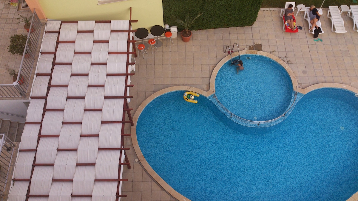 Mi alojamiento está en un pequeño complejo maravilloso en primera línea en Sveti Vlas. Fácil acceso a una pequeña playa salvaje a solo 2 minutos a pie. Muy cerca hay otra playa más grande e divertida a 5 minutos a pie, tienda de comestibles a 15 minutos a pie. En el complejo a tu disposición hay una piscina y un acogedor restaurante. Es bueno para parejas, aventureros solitarios y familias (con niños).