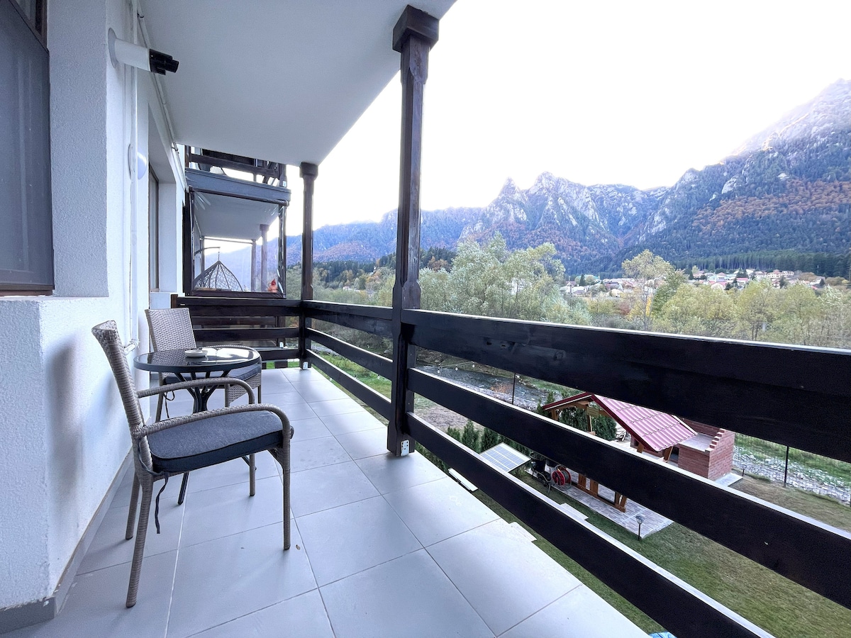 Welcome to Riverside Linda’s Apartment, an elegant apartment by the river. This meticulously designed apartment features two stylish bedrooms featuring a refined aesthetic and soft neutral tones. Enjoy your favorite shows on the smart TV, and gather at the dining table in the open-space kitchen thar offers an espresso machine and modern induction stove. Step out onto the balcony to savor breathtaking views of the Prahova river and Bucegi mountains. Experience sophistication in every detail!