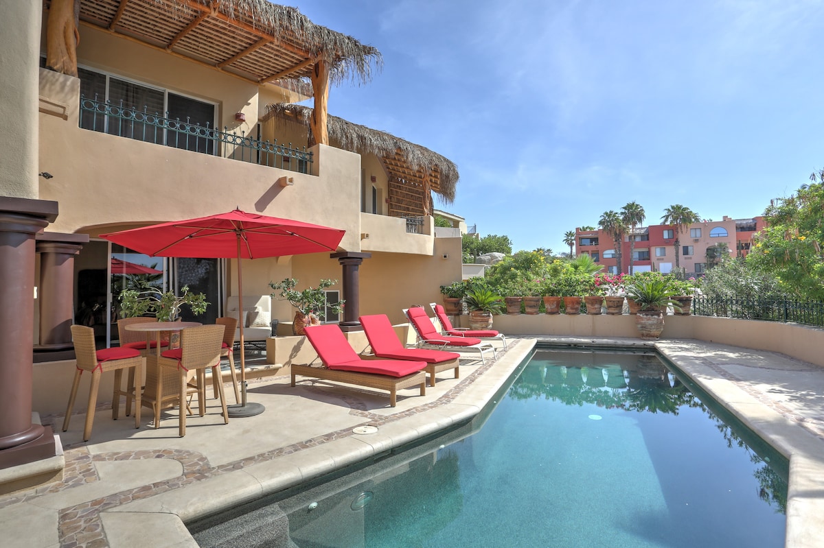 The condo's 180º view lets you enjoy sunrise and sunset at the Cabo Arch from your breakfast-dinner table! Terrace design offers intimacy and escape. Ideal for a romantic stay, home office with paradise views, BBQ dinners with sunset vistas, relaxing hammock siestas, whale-watching while cooking, and sunrise views from bed! Walking access to Cabo's top two beaches and next to The Cape and Thompson Hotel. Please remember, this is a rental condo, not a hotel, and the price reflects that.