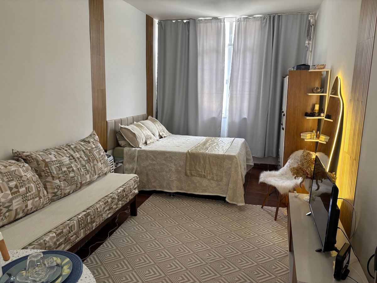 Piensa en un apartamento compacto con todo lo necesario, muebles planificados, extremadamente funcional para una pareja, cómodo, ideal para ver una buena película o serie, cocina bien equipada para comidas rápidas, aperitivos o snacks, una cama acogedora y un baño precioso y lujoso, por no hablar de la vista privilegiada, la privacidad y la ubicación. ¡Reserva y disfruta! ¿No tienes disponibilidad para tu fecha? Póngase en contacto con nosotros, tenemos otra opción similar en el mismo edificio, ¿a qué espera? ¡VENGA!