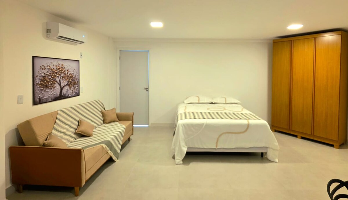 Disfruta de días increíbles en Cabo Frio alojándote en nuestro amplio y cómodo loft, en el encantador barrio de Passage, a pocos metros de Praia do Forte y del borde gastronómico de la ciudad. Tiene capacidad para 5 personas y es perfecto para familias o grupos pequeños que desean combinar ubicación, comodidad y economía. • ❄️ Aire acondicionado • 🚗 Aparcamiento • 📺 Smart TV y wifi • 🧊 Minibar • Cerradura🔒 digital • 🛏️ 1 cama doble + 1 sofá cama, ropa de cama y toallas incluidas