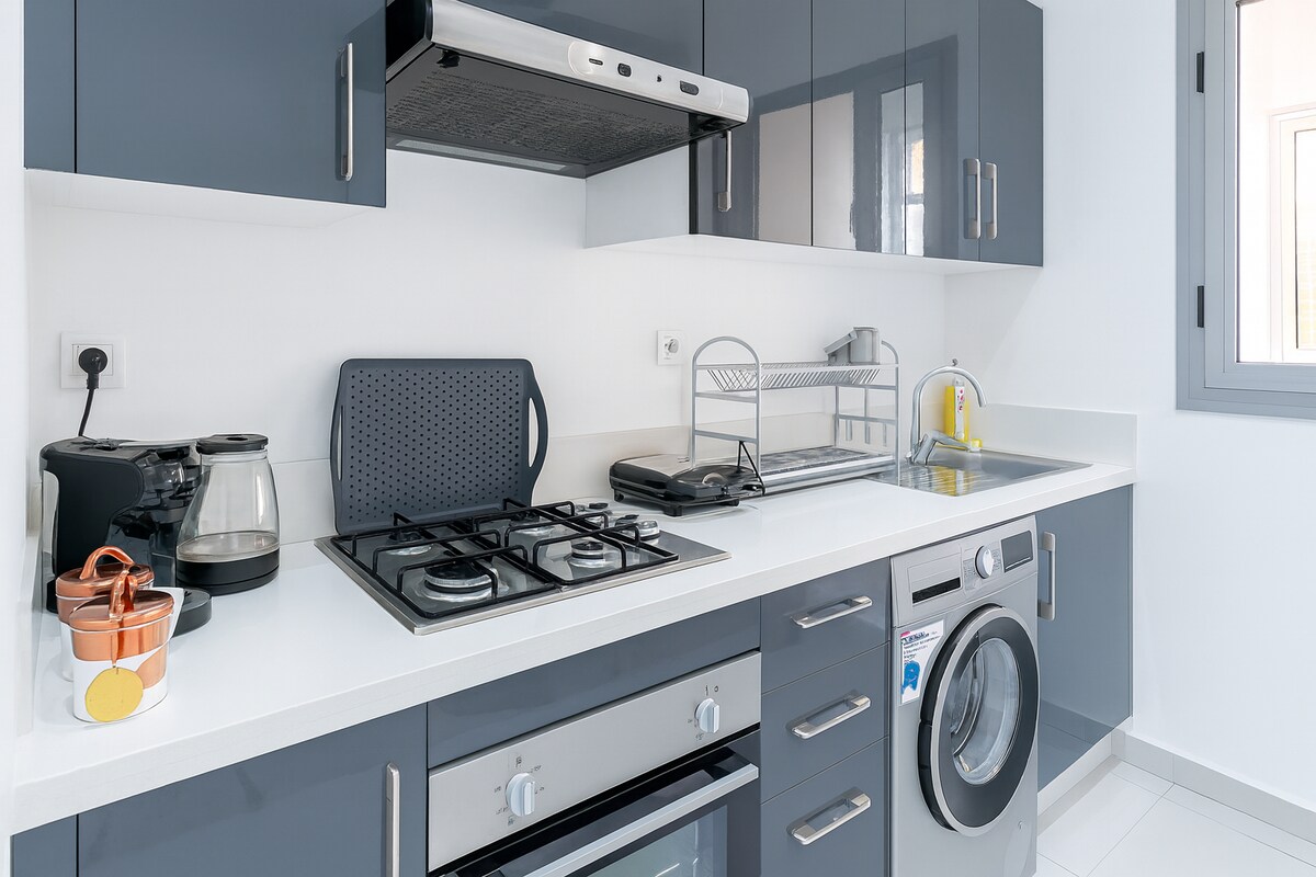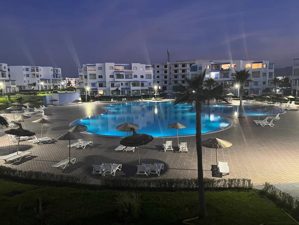Increíble departamento de 3 camas con todas las comodidades totalmente amueblado con acceso a 7 grandes piscinas, gimnasio exterior, zona de juegos infantiles, estacionamiento privado las 24 horas de seguridad totalmente aislado, wifi gratuito, este apartamento cuenta con impresionantes vistas a la montaña, a poca distancia de la playa, este apartamento está ubicado en el norte de Marruecos.