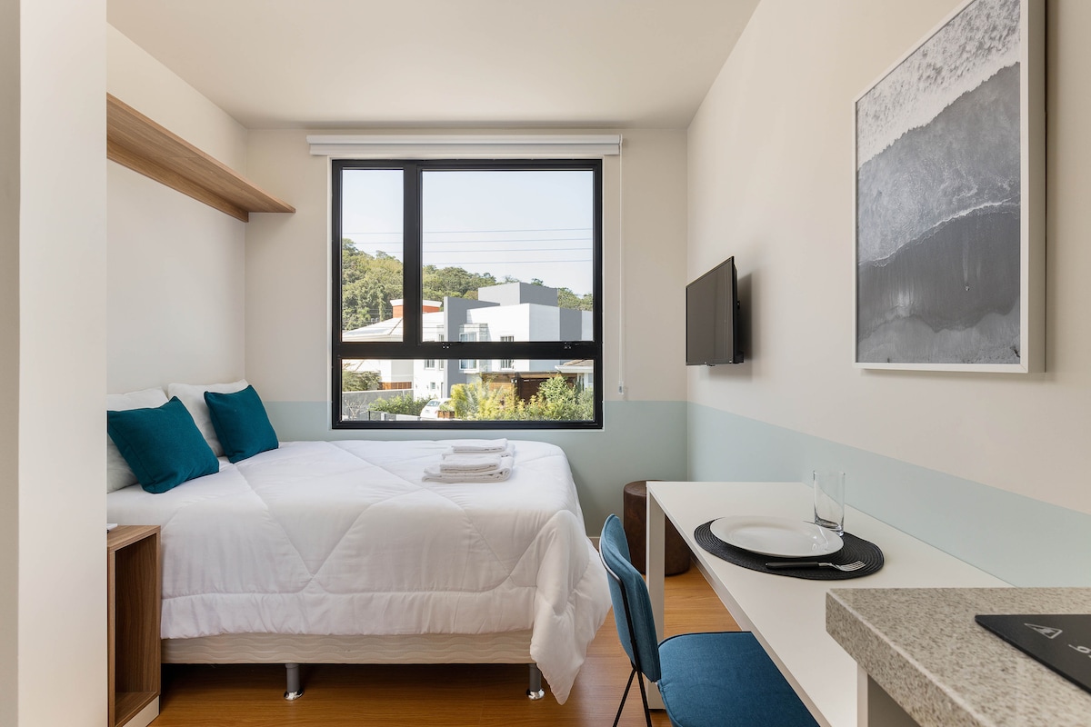 Relájate y disfruta de días ligeros en este acogedor y contemporáneo loft, ubicado en una tranquila región de Canasvieiras, perfecto para aquellos que buscan descanso, comodidad y practicidad cerca del mar, de nueva construcción, con jacuzzi climatizado, iluminación escénica, balcón con parrilla y vista panorámica. 🌿 Naturaleza y tranquilidad Por la mañana, el ambiente es agradable, con la presencia de aves que se pueden ver y oír, creando una atmósfera de refugio y bienestar incluso en temporada alta.