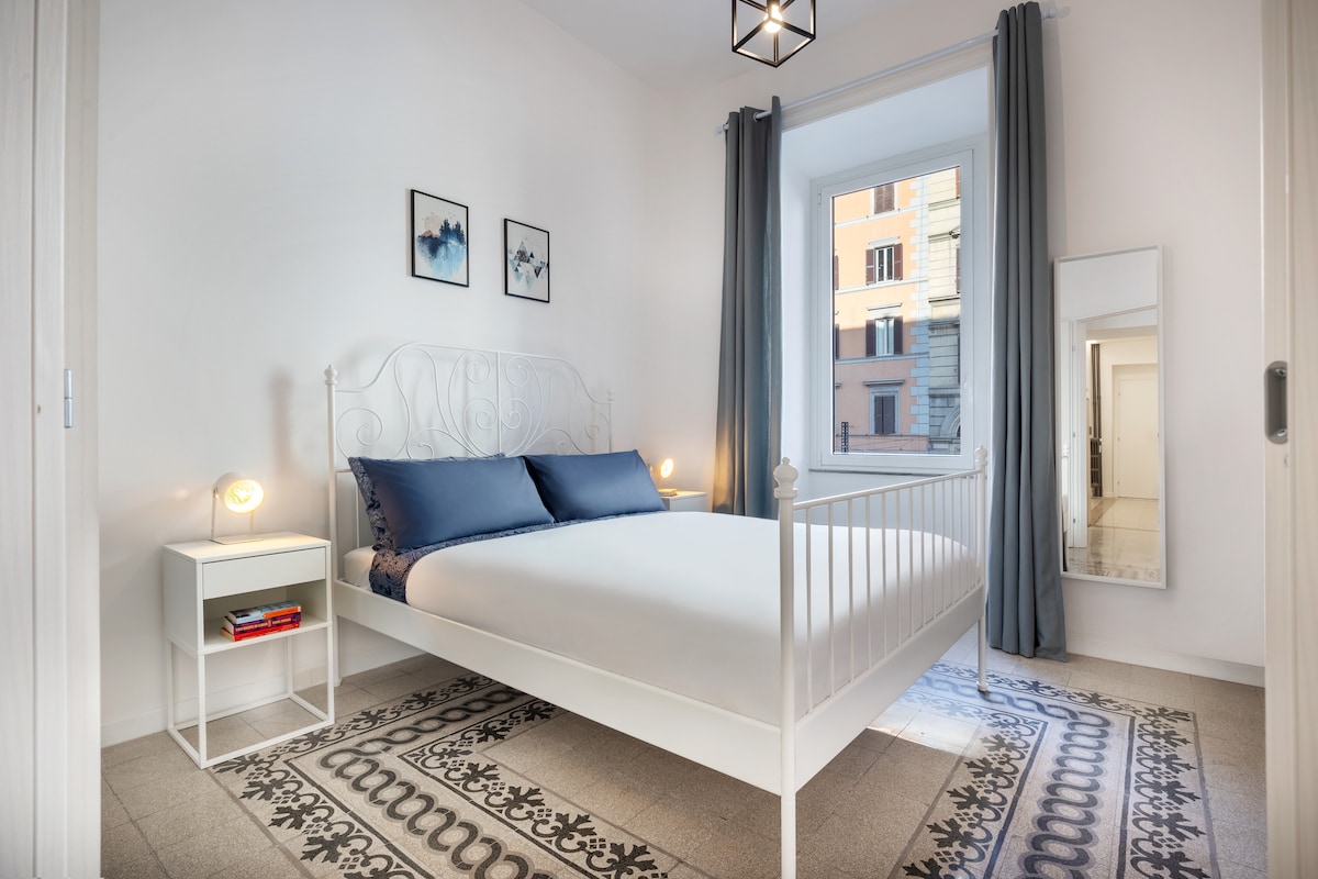 Apartamento único situado en la planta principal del Palazzo Alibrandi (siglo XVI), en una plaza tranquila junto al Campo dei Fiori. Pasado el hermoso patio interior, el apartamento se desarrolla con una gran entrada con paredes con frescos y una prestigiosa vidriera Art Déco. La suite privada, recientemente renovada, tiene techos artesonados de 6 metros y muebles de gran valor. Desde la ventana se accede a un balcón con vistas a la plaza. La limpieza de 50 € se pagará durante la estancia.