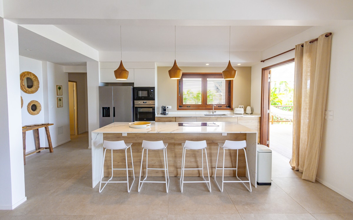 Casa , vistas 180° al mar Caribe. Playa a 50 metros. Cocina totalmente equipada (placa, microondas, lavavajillas, lavadora, etc.), aire acondicionado en las habitaciones, gran terraza de 50 m2. Bar abierto en el porche. Cubierta con solárium y barbacoa. Amplias habitaciones con armarios empotrados. 2 baños, 2 aseos. Salón y comedor en el porche. Wifi gratuito (fibra) Cerca de una carretera transitada que provoca ruido de coches durante el día. Este inconveniente desaparece por la tarde y la noche.