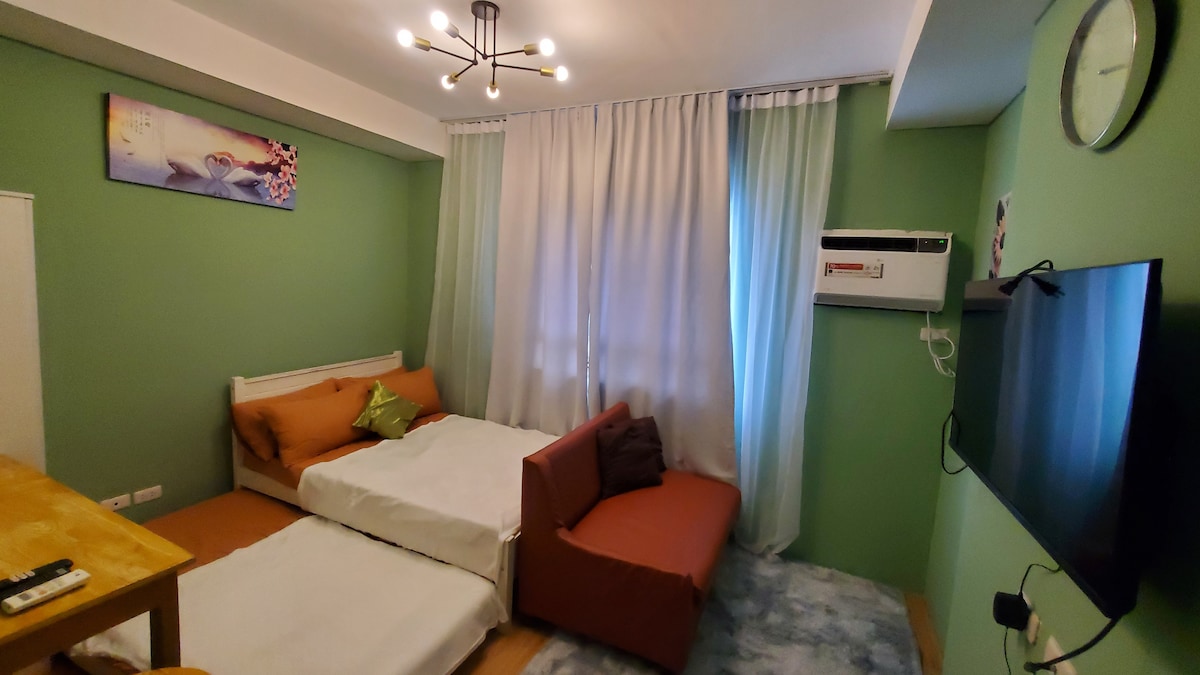 Unidad tipo estudio muy acogedora en Primavera Citta Verde, junto al centro comercial SM Uptown y frente al Palacio de Justicia, con internet rápido y fiable (120 Mbps), cama tamaño queen con cama extraíble y cocina modular integrada donde puedes cocinar si no quieres salir. Comedor, sala de estar y baño. Disfruta de una experiencia de lujo en este céntrico alojamiento.